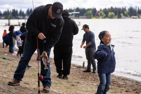 We host the event in collaboration with the Washington Department of Fish and Wildlife. A netted area near the beach is stocked with fish from our local hatcheries. Each kid is given their own pole to keep and enjoys a 60-minute teaching session. Additionally, bait and bags for caught fish are provided.